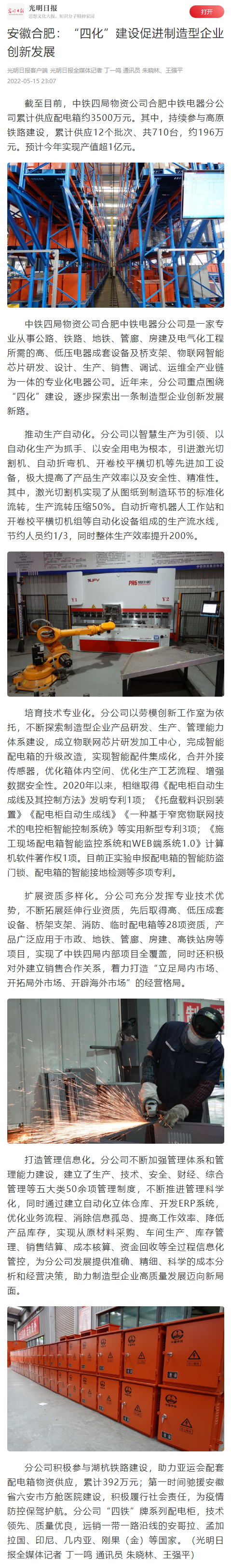 据悉,分公司积极参与湖杭铁路建设,助力亚运会配套配电箱物资累计392万元;第一时间驰援六安市方舱医院建设,展现国企速度和担当,积极履行社会责任,为疫情防控保驾护航。分公司“四铁”牌系列配电柜,靠着技术领先、质量优良等特点,颇受好评,产品远销一带一路沿线的安哥拉、孟加拉、印尼、几内亚、刚果(金)等国家。