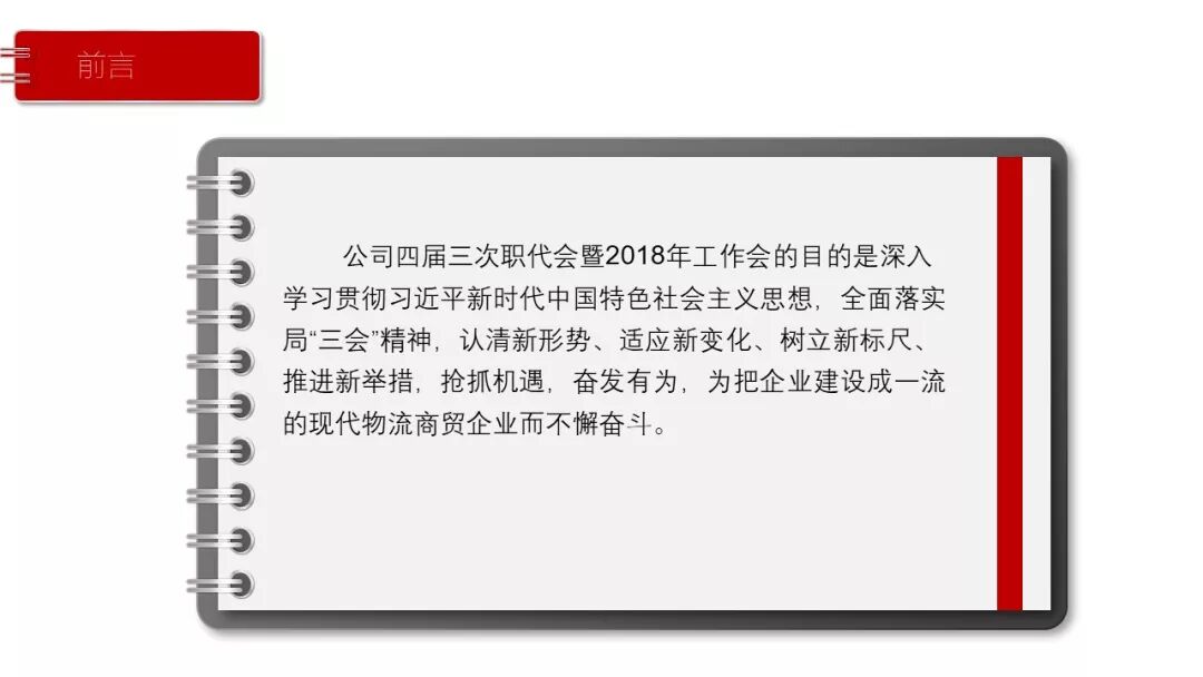 3月12日上午,物资公司四届三次职工代表大会暨2018年工作会在合肥公司本部胜利召开。公司党委书记、执行董事晏荣龙代表公司党委作了题为《立足新时代 贯彻新思想 争创新辉煌 以十九大精神引领企业持续健康发展》的重要讲话,全面回顾总结了2017年各项工作,安排部署了2018年的目标任务。