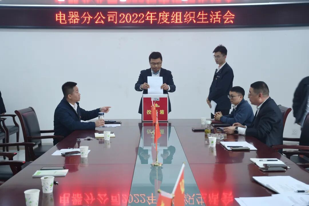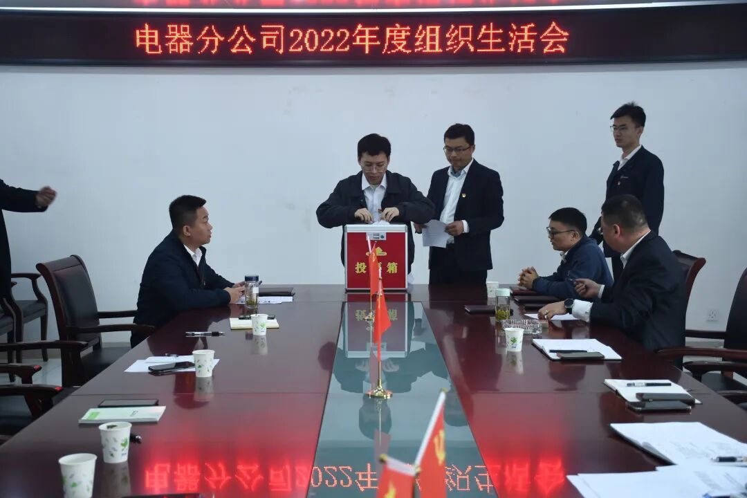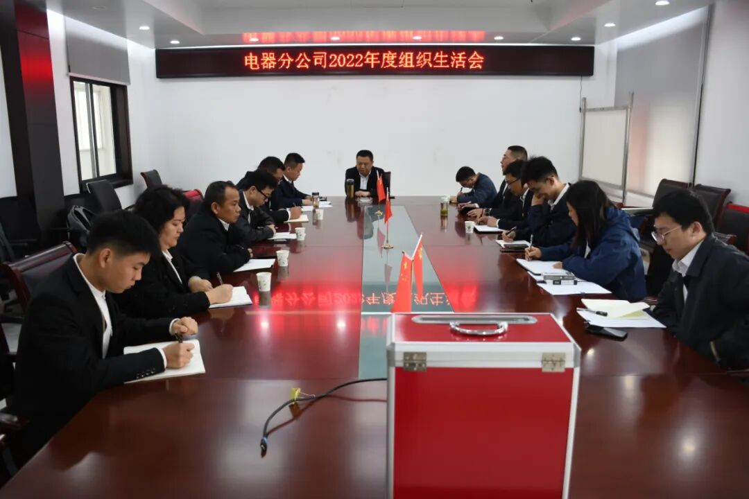 3月30日上午,电器分公司党支部召开2022年度组织生活会并开展民主评议党员工作。公司副总经理宋涛莅临指导。公司党群工作部副部长耿汉东参加会议,分公司党支部书记朱晓林主持会议。