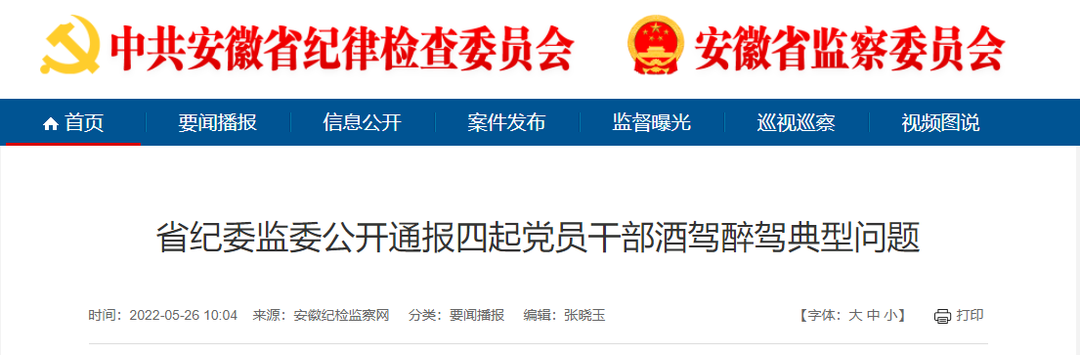 5月26日,安徽省纪委监委公开通报四起党员干部酒驾醉驾典型问题。