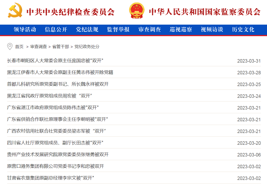 长春市朝阳区人大常委会原党组书记、主任庞国忠被开除党籍和公职;黑龙江省伊春市人大常委会原副主任黄志伟被开除党籍;首都儿科研究所原党委副书记、所长魏永祥严重违纪违法被开除党籍和公职,等等。